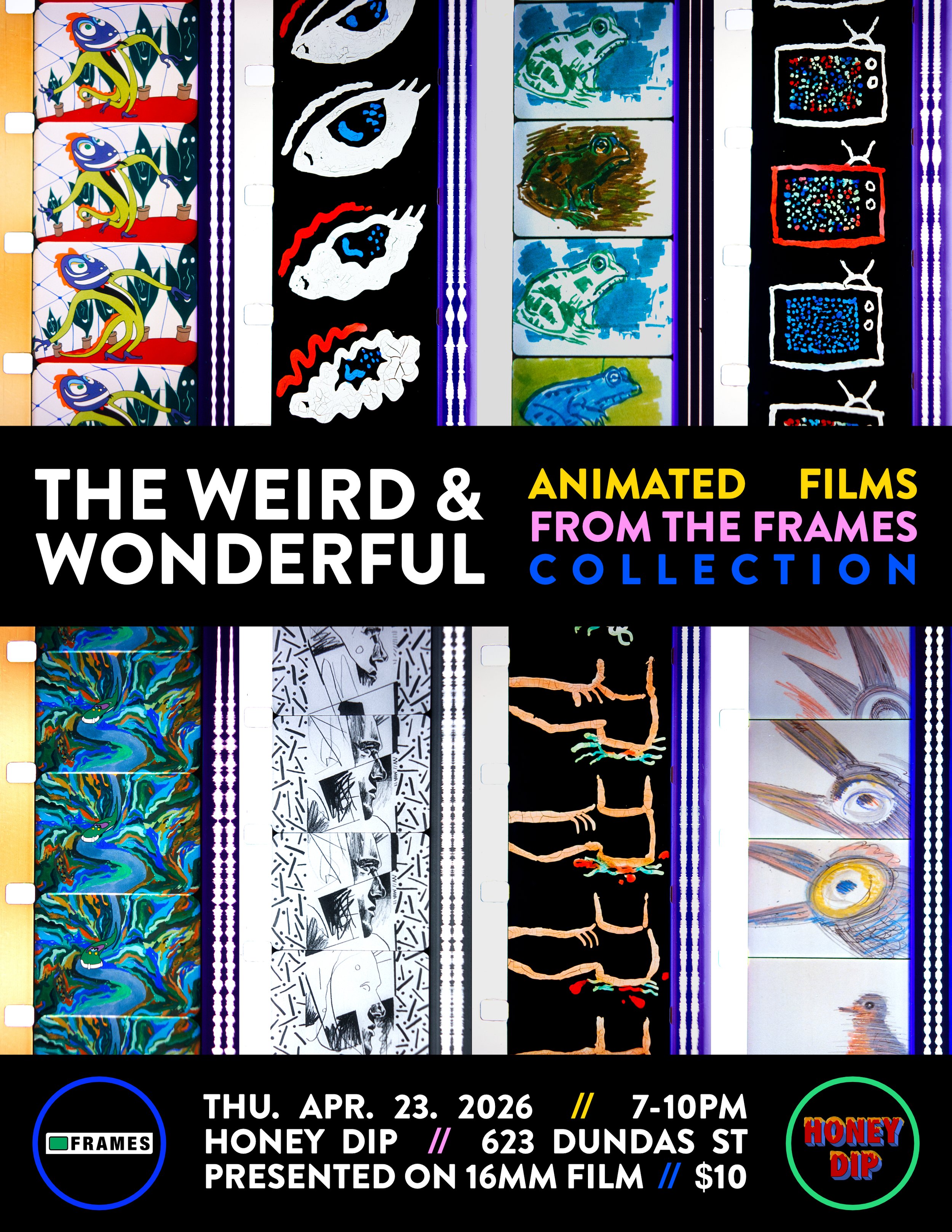 FRAMES presents a unique offering of independent, obscure and experimental animation projected entirely on 16mm film. Our thanks again to Honey Dip for providing their ideal loungy atmosphere for another casual evening supplied with craft-beers, snacks & cocktails.